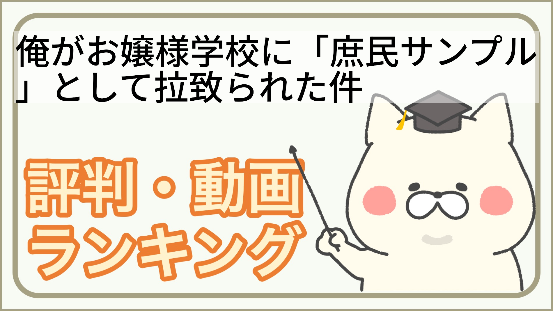 俺がお嬢様学校に「庶民サンプル」としてゲッツされた件は 放映期間2015年 10月7日 - 12月23日 に方法されていたアニメです。 制作会社はSILVER LINK.で AT-Xで放送されていました。話数は全12話でして、 俺がお嬢様学校に「庶民サンプル」として拉致られた件シリーズの第1作目の 作品です。 俺がお嬢様学校に「庶民サンプル」としてゲッツされた件の人気具合ですが、 良い(視聴おすすめ)が26ポイント。悪い(視聴しなくていい)が29です。